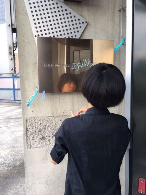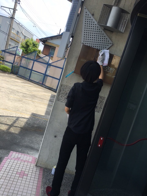 そとの看板を磨いてもらっていました。