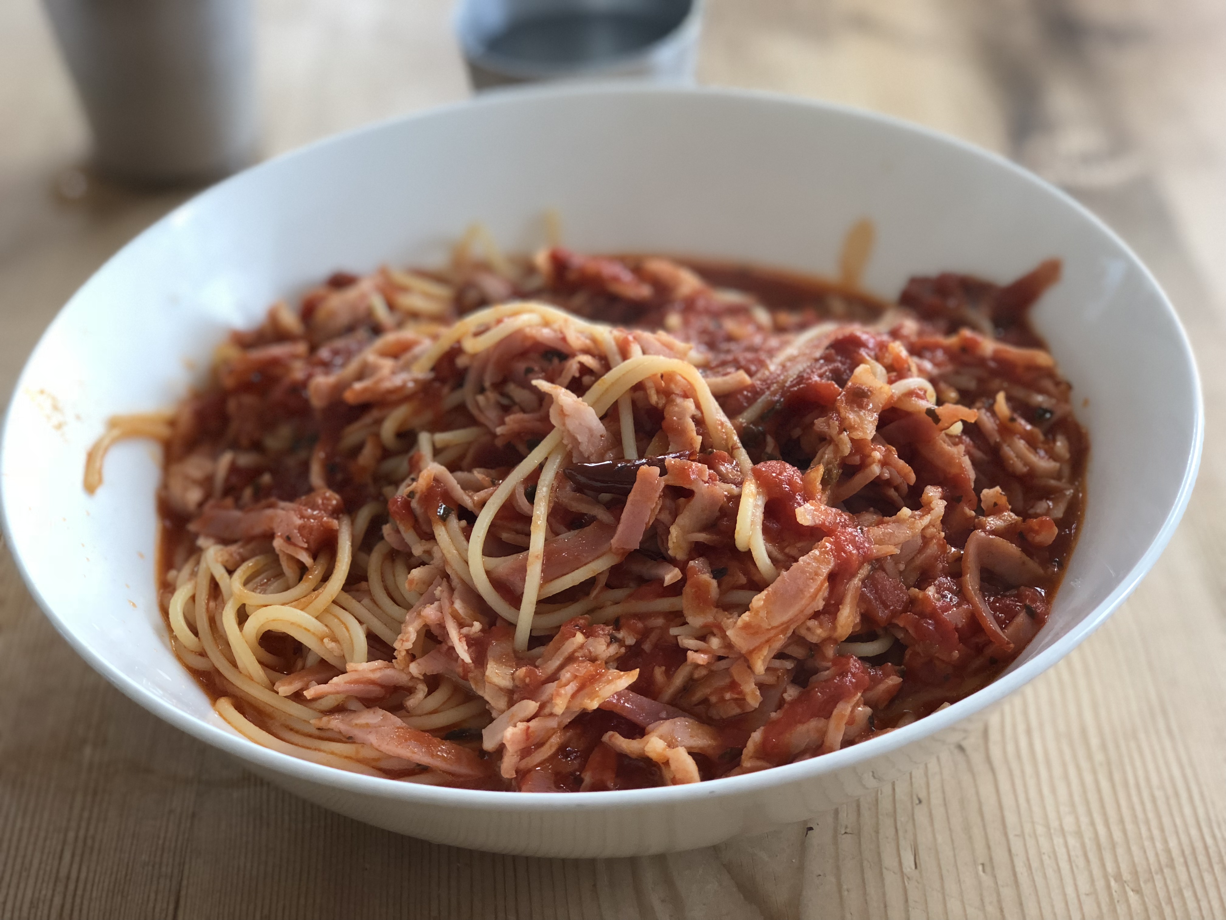 僕はベーコンガーリックトマトソーススパゲッティを注文しました。