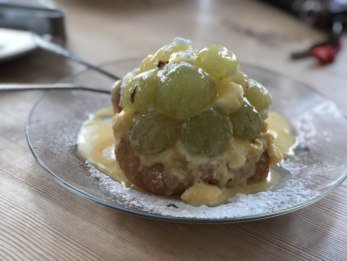 すごく甘くて種なし皮もむいてある巨大なブドウが大量に乗ってます。